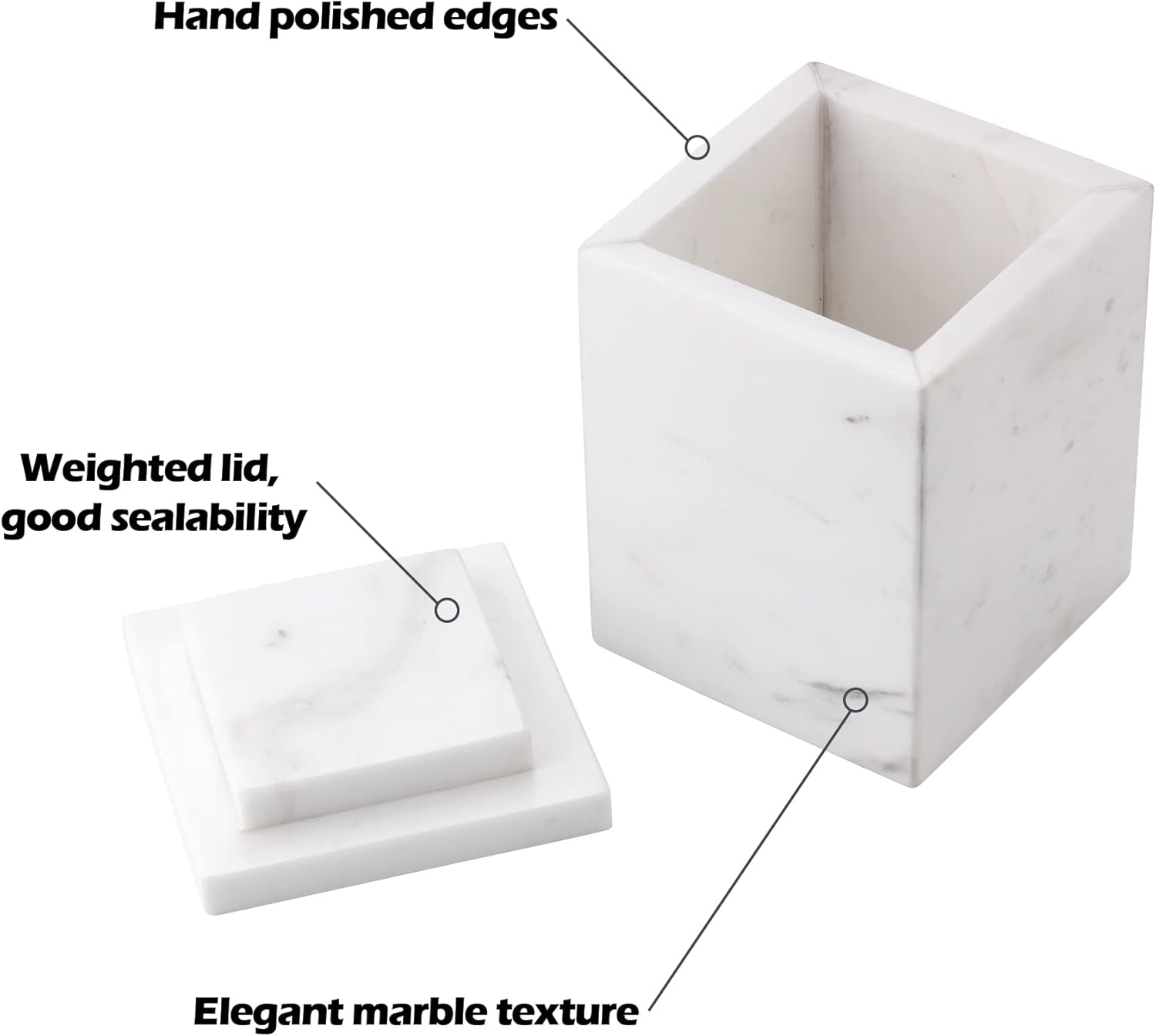 WORHE Marble Canister Natural Stone Qtip Holder with Lid Square Bathroom Vanity Organizer for Makeup Sponge Coffee Bean Dispenser Storage Jar Case for Home Decor White (DLW201)
