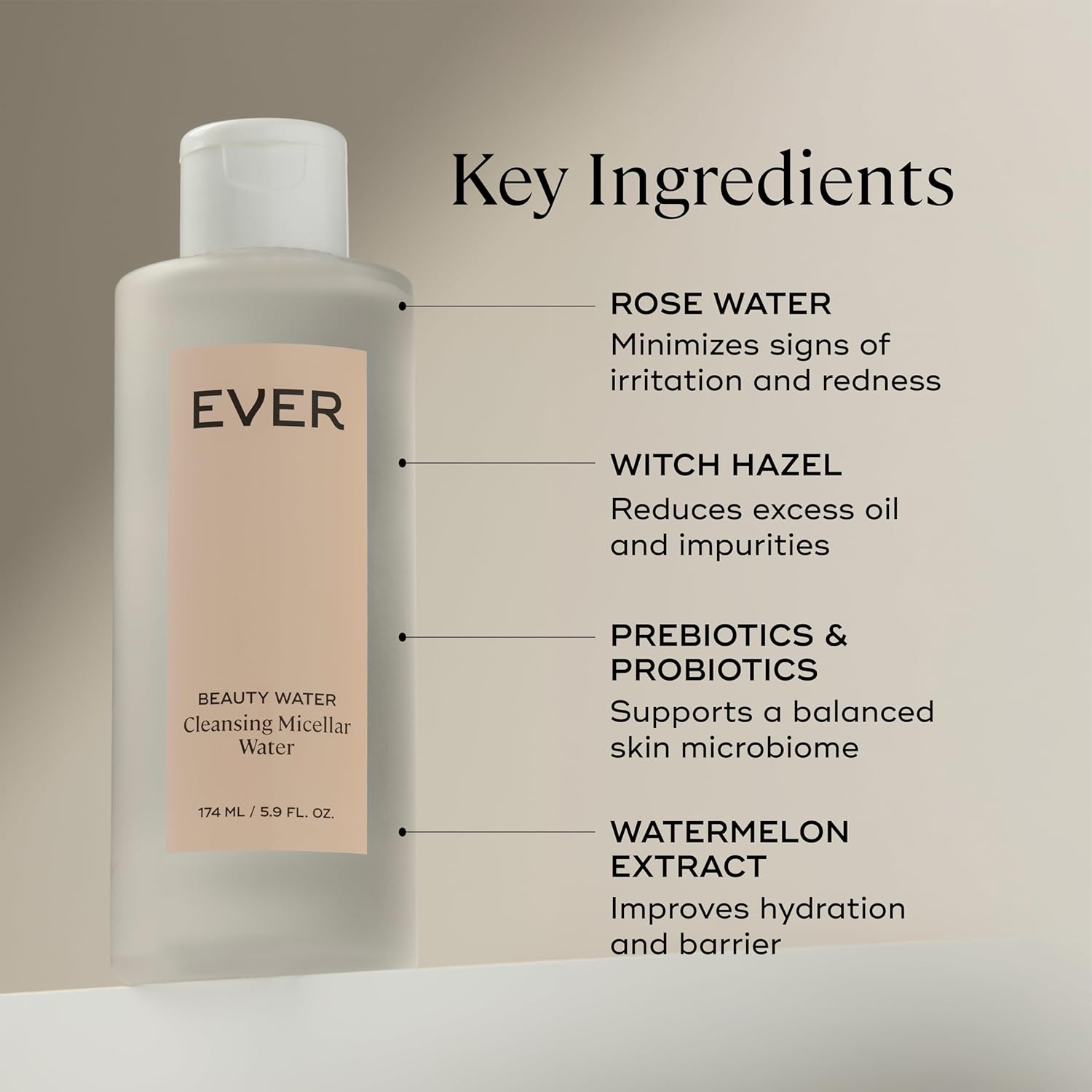 EVER Beauty Water Micellar Cleaning Water & Eye Makeup Remover – Rose Water, Lactic Acid & Pro/Prebiotics Cleanser for Sensitive Skin, Removes Waterproof Makeup, Tones & Hydrates - 5.9 fl oz