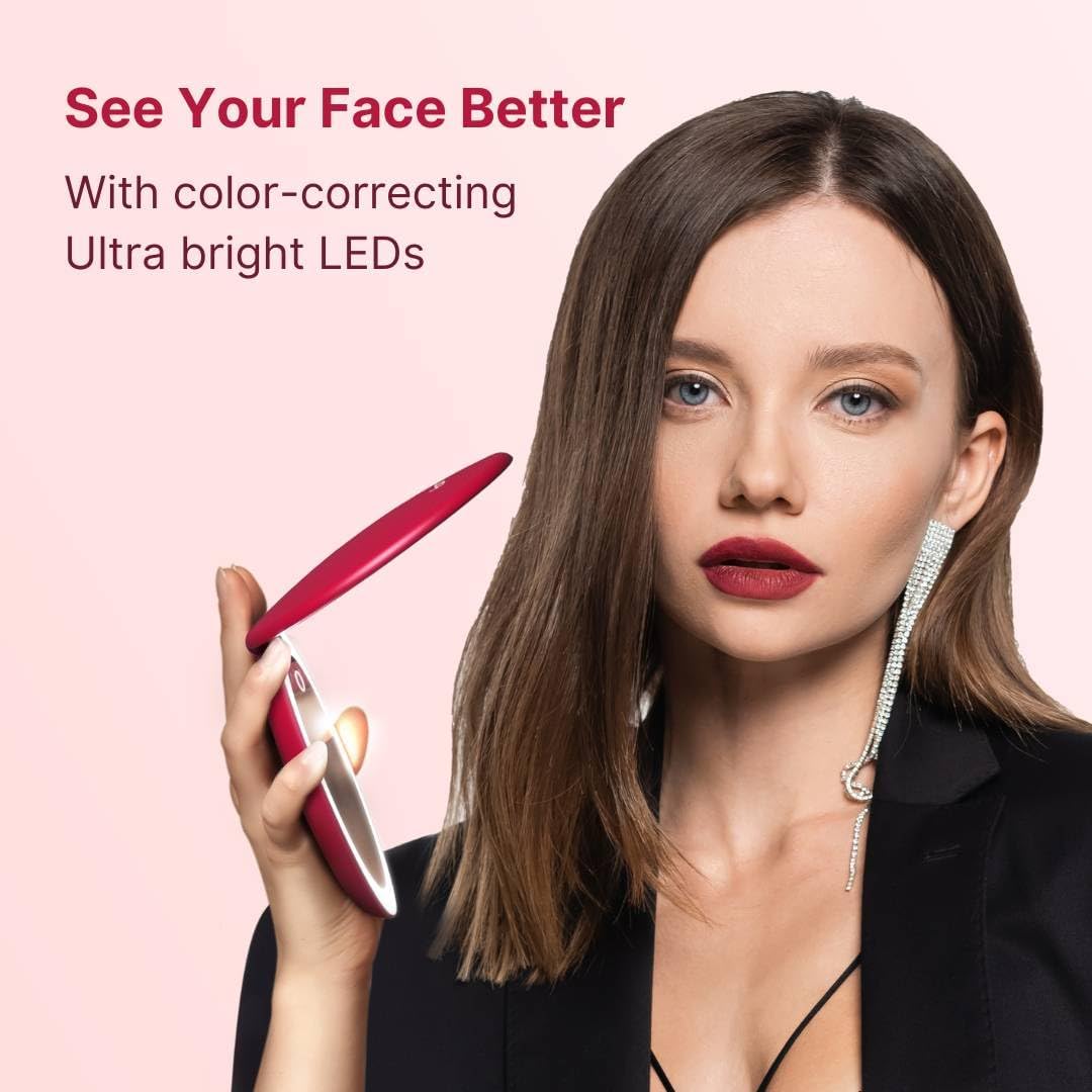 Fancii Taylor LED Lighted Travel Makeup Mirror, Rechargeable, 10x /1x Magnifying, Tru-Glow Light Technology, XL Large 5” Wide | Compact Mirror for Purses (Ruby Red)