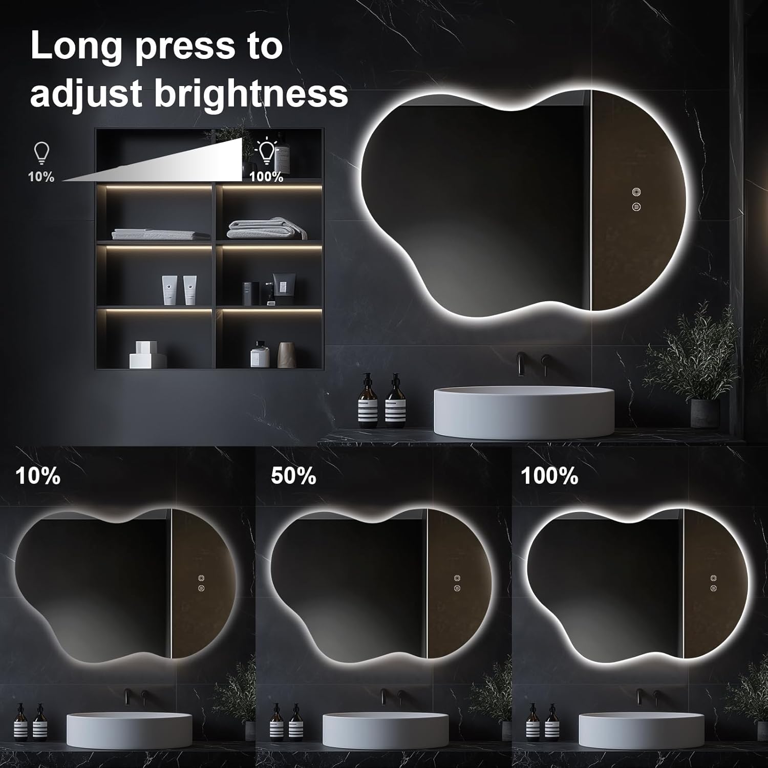 - Eco-Friendly 5MM Asymmetrical LED Bathroom Mirror: Crafted from copper-free, environmentally friendly materials, this mirror features a silvered reflective layer for a sharp, clear image.